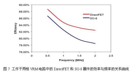 圖7示出了工作于兩相VRM電路中的DirectFET和SO-8器件的效率與頻率的關系曲線。兩者的效率測量都是在20A/相位的負載電流條件下進行。在整個頻譜范圍內,采用DirectFET的VRM電路表現出高于采用SO-8的VRM電路的效率水平。兩種電路的效率差異還會隨著頻率的升高而增大。該結果反映出DirectFET器件的封裝寄生損耗較SO-8器件低。DirectFET封裝器件還能夠在更高的負載電流條件下工作。例如,在1MHz條件下,DirectFET VRM電路能夠對高達30A/相位的負載電流進行開關操作,并同時將電路板的溫度維持在100℃以下。而在相同的工作條件下,SO-8器件則只能對20A/相位左右的負載電流進行開關操作。DirectFET VRM電路較高的電流處理能力可歸功于結合了更低的封裝寄生效應以及更高的熱