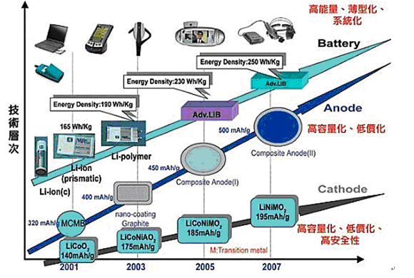 鋰二次電池雖然已廣泛使用于3C產品上,然而隨著筆記型電腦使用1GHz CPU而增加耗電量,以及LCD螢幕尺寸加大、解析度提高、使用高容量硬碟及DVD-ROM等趨勢,未來筆記型電腦整體功率消耗明顯提高,因此對鋰電池主要的技術提升需求,包括提升電池能量密度、降低重量與智慧型電源管理。未來行動電話從2G提升至3G時,不論是GSM、WCDMA等系統,所需要的電池能量密度都需要明顯的增加。目前薄型鋰電池系統的重量能量密度雖有顯著的提升,但主要是罐體外殼的輕量化,在電極材料的性能提升上,進展較少。針對3G所強調的高體積能量密度>420 Wh/L要求,目前薄型鋰電池的體積能量密度(340~360 Wh/L)仍無法符合其規格目標。未來各種多功能的手錶(Multifunctional Watch),將具有Phone、DSC、MP3等功能,此時對能量密度高且薄型化鋰電池的需求更加迫切,另一方面3G行動電話與結合電腦、PDA、行動電話等功能的行動資訊與通訊終端產品(Mobile IA),將大量地被使用,對具有高能量密度的鋰電池同樣迫切需求,如(圖二)。因此開發高容量及高功率的納米級鋰電池材料,并應用于新世代的納米鋰電池上,是全世界鋰電池業者目前最重要需突破的目標。