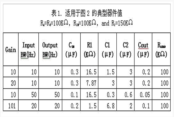 設計單電源運算放大器電路,需要考慮輸入偏置電流誤差、電源抑制、增益、以及輸入與輸出線路帶寬等等。然而普通的應用設計是可以通過查表來獲得,見表1。在單電源電壓為15V或12V時偏置分壓的兩個電阻通常選用100kΩ,這樣可以在電源消耗與輸入偏置電流誤差之間合理的折中。5V單電源偏置分壓電阻減小到一個比較低的值,例如42kΩ。還有些在3.3V應用中偏置分壓電阻選在27kΩ左右。