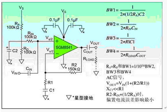 首先,電路的電源抑制幾乎沒有,電源電壓的任何變化都將直接通過兩個分壓電阻改變偏置電壓Vs/2,但電源抑制的能力是電路非常重要的特性。例如此電路的電源電壓1伏的變化,能引起偏置電路電壓的輸出Vs/2變化0.5伏。該電路的電源抑制僅僅只有6dB,通過選用SGM8541運算放大器可以增強電源抑制能力。