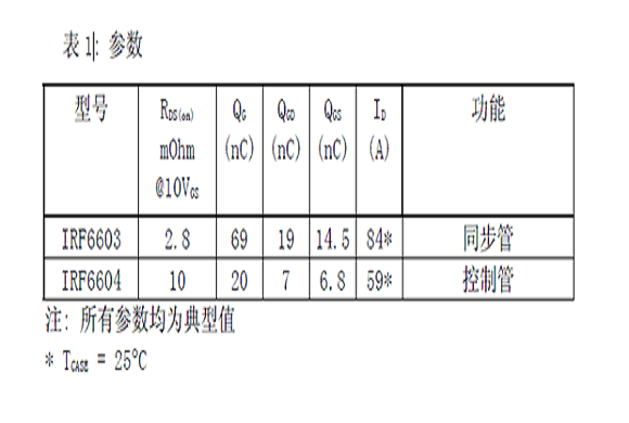 此設(shè)計(jì)可以高效輸出超過100A(>25A/相)的電流而面積只有95mm×31mm(3.8inch X 1.25inch )。每項(xiàng)均使用一個(gè)控制管和一個(gè)同步管的DirectFET MOSFET。用作控制管和同步管的30V DirectFET的規(guī)格見表1。請注意它們高的載流能力省去了器件并聯(lián)的需要。