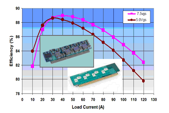 VRM線路板被重新設(shè)計(jì),用4Oz厚覆銅,進(jìn)一步減小PCB走線電阻,改善熱性能。圖2所示為這款4Oz厚覆銅板的VRM,在500KHz工作頻率,12V輸入電壓,1.7V輸出電壓,600LFM風(fēng)冷的條件下的效率曲線。在一個(gè)很寬的負(fù)載電流范圍內(nèi),7.5V柵驅(qū)動電壓表現(xiàn)出更高的效率。此款VRM在最大負(fù)載電流120A時(shí),效率達(dá)到82%。