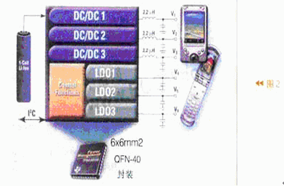 圖2是TI公司的一種電源管理IC(TPS65021)的功能結(jié)構(gòu)示意圖。它由1節(jié)鋰離子電池供電,由微處理器通過I2C與器件接口。TPS65021內(nèi)部有控制功能電路及6個(gè)電源(3個(gè)DC/DC轉(zhuǎn)換器,3個(gè)線性穩(wěn)壓器LDO,輸出V1-V6電壓)。它可以給手機(jī)供電及實(shí)現(xiàn)負(fù)載管理。