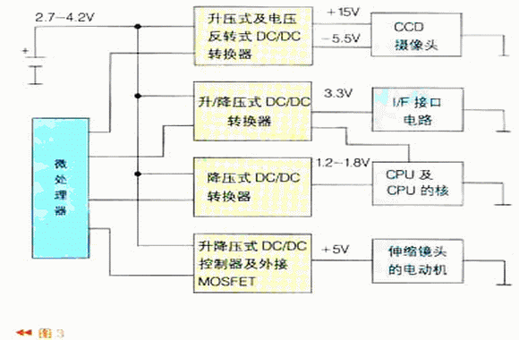 數(shù)碼相機(jī)中有三種電源:系統(tǒng)電源、LCD電源以及白光LED驅(qū)動(dòng)電源(背光照明及閃光燈電源)。系統(tǒng)電源部分由4個(gè)DC/DC轉(zhuǎn)換器組成,如圖3所示。它分別給CCD攝像頭、I/F接口電路、CPU的核及伸縮鏡頭的電動(dòng)機(jī)供電,通過微處理器可做負(fù)載管理,微處理器也可以根據(jù)工作狀態(tài)要求來控制LCD背光亮度及閃光燈驅(qū)動(dòng)電路。