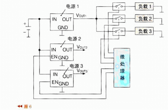 在實(shí)際應(yīng)用中,往往由于電路復(fù)雜而采用電源管理IC及多個(gè)負(fù)載開關(guān)組成的負(fù)載管理系統(tǒng),如圖6所示。圖6中有3個(gè)電源,輸出不同的電壓。電源1給負(fù)載1~3供電。為了控制負(fù)載1~3的通電或失電,在電源與負(fù)載之間設(shè)了3個(gè)負(fù)載開關(guān)。電源2、電源3則由電源管理IC來控制其負(fù)載的通電或失電。