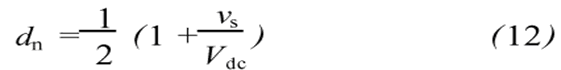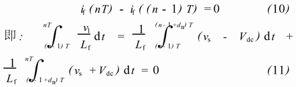 單相電壓源型有源濾波器直流側(cè)以電容作為儲(chǔ)能元件來(lái)維持直流電壓Vdc恒定。設(shè)開(kāi)關(guān)周期恒定為T,第n個(gè)開(kāi)關(guān)周期內(nèi)占空比為dn,則這個(gè)開(kāi)關(guān)周期內(nèi)兩對(duì)開(kāi)關(guān)管分別導(dǎo)通的時(shí)間為dn*T和(1-dn)*T,從而分別可以得到兩個(gè)電壓平衡方程: