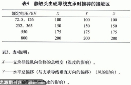 單柱垂直斷口隔離開關(guān),因其靜觸頭懸掛在母線上,為了適應(yīng)風(fēng)力、溫度和冰雪的影響,確保隔離開關(guān)能可靠合閘,GB1985對(duì)接觸區(qū)(也稱鉗夾范圍)提出了推薦值,如表3、表4。在進(jìn)行變電站設(shè)計(jì)和選用隔離開關(guān)時(shí),應(yīng)考慮到具體運(yùn)行條件,確保靜觸頭處在規(guī)定的接觸區(qū)限值之內(nèi),使隔離開關(guān)能正確地分合閘。