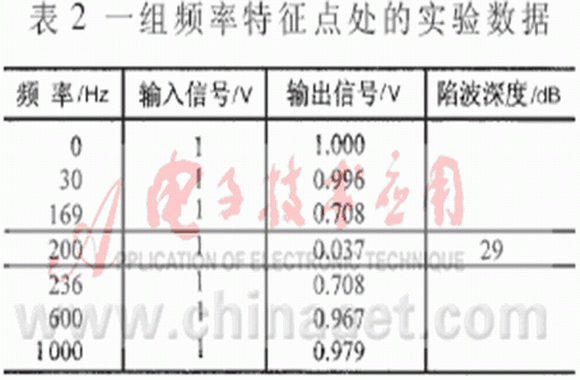 在此以fn=200Hz來設計帶阻濾波器以濾除撓性陀螺輸出信號中的干擾噪聲。根據圖4電路,采用高精度的分離元件來搭建濾波電路。取K1=K3=K4=0.022,K5=0.33(Q=3),由式(9)可知,需要提供的開關時鐘頻率為fCLK=57.12kHz。當要濾除干擾噪聲的諧波分量時,無須改變任何外接電路,而只要將開關時鐘頻率成倍提高即可。