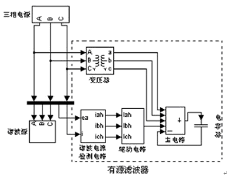 該有源濾波器主要由諧波電流檢測電路、驅動電路、主電路、電容器和變壓器5大部分組成。變壓器的設置主要是為調節有源電力濾波器交流側電壓之用。其原理如圖1所示。其中的諧波源模塊是根據主提升機房實際諧波測試數據建成的。