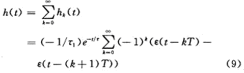 由式(8)可見,第k段的非零值時區(qū)為(kT,(k+1)T_),即各時段非零值區(qū)間互不重疊,對hk(t)關于k求和,得開關電容電路(對外)的單位沖激零狀態(tài)響應h(t)為:
