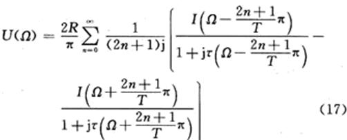 上式說明,Ie(Ω)是輸入電流頻譜I(Ω)周期延拓的組合,周期為Ω0=2π/T。各電流分量流過RC并聯(lián)支路時的電壓為相應電流分量與RC支路阻抗(R/(1+jωτ),ω=Ω±(2n+1)π/T)的乘積,于是輸出電壓頻譜U(Ω)為:
