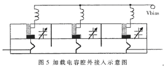 傳統(tǒng)的小信號電調(diào)螺旋諧振腔、濾波器中,加載電容采用腔內(nèi)安裝接入方式。這種方式易實現(xiàn),但在高頻情況下,腔內(nèi)強行添加異物,使本來就復(fù)雜的螺旋腔場分布變得更為復(fù)雜,導(dǎo)致工作特性難以把握。同時,新物體帶來的分布電容將引起中心頻率的偏移,嚴(yán)重時造成中心頻率超越所需頻段。