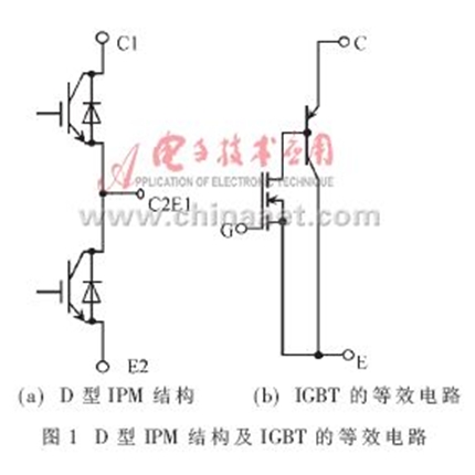 IPM由高速、低功率的IGBT芯片和優(yōu)選的門級驅(qū)動及保護(hù)電路構(gòu)成,如圖1所示。其中,IGBT是GTR和MOSFET的復(fù)合,由MOSFET驅(qū)動GTR,因而IGBT具有兩者的優(yōu)點(diǎn)。