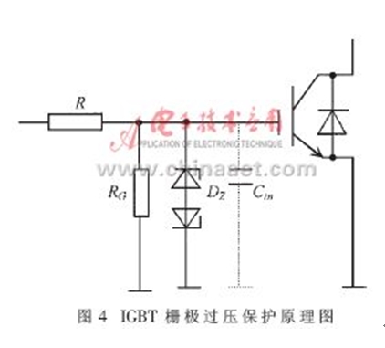 IGBT的驅(qū)動設(shè)計(jì)問題亦即MOSFET的驅(qū)動設(shè)計(jì)問題;設(shè)計(jì)時(shí)應(yīng)注意以下幾點(diǎn):①IGBT柵極耐壓一般在±20V左右,因此驅(qū)動電路輸出端要給柵極加電壓保護(hù),通常的做法是在柵極并聯(lián)穩(wěn)壓二極管或者電阻。前者的缺陷是將增加等效輸入電容Cin,從而影響開關(guān)速度,后者的缺陷是將減小輸入阻抗,增大驅(qū)動電流,使用時(shí)應(yīng)根據(jù)需要取舍。圖4為IGBT柵極保護(hù)原理圖,其中,RG、DZ、Cin分別為等效柵極阻抗、穩(wěn)壓管和等效輸入電容。②盡管IGBT所需驅(qū)動功率很小,但由于MOSFET存在輸入電容Cin,開關(guān)過程中需要對電容充放電,因此驅(qū)動電路的輸出電流應(yīng)足夠大,這一點(diǎn)設(shè)計(jì)者往往忽略。假定開通驅(qū)動時(shí),在上升時(shí)間tr內(nèi)線性地對MOSFET輸入電容Cin充電,則驅(qū)動電流為,其中可取tr=2.2RCin,R為輸入回路電阻。③為可靠關(guān)閉IGBT; 防止擎住現(xiàn)象; 要給柵極加一負(fù)偏壓,因此最好采用雙電源供電。