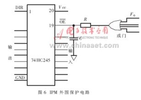 方案一 PWM接口電路前置74HC245、74HC244等帶控制端的三態(tài)收發(fā)器,如圖6所示。IPM的控制信號經(jīng)過74HC245的輸入、74HC245的輸出后送至IPM接口電路;各個(gè)IPM的故障輸出信號經(jīng)光耦隔離輸出后得到高電平FO,送入或門,或門輸出經(jīng)過R-C低通濾波器后,送入74HC245的使能端/OE。IPM正常工作時(shí),或門輸出為低電平,74HC245選通;IPM故障報(bào)警時(shí),或門輸出為高電平,74HC245所有輸出置為高阻,封鎖各個(gè)IPM的控制信號,關(guān)斷IPM;實(shí)現(xiàn)了保護(hù)功能。