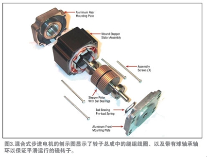 混合式步進電機結合了永磁和開關磁阻電機的工作原理,在轉子軸上裝有一對或多對外圓周有很多齒的定子疊片,在每對定子疊片間有一個永磁體,會在軸向上生成北極和南極。齒的數量、電機結構與驅動方案等幾項因素確定了電機的步進角度,多數應用指定了混合式步進電機1.8°的步長(每轉200步長)(見參考資料)。