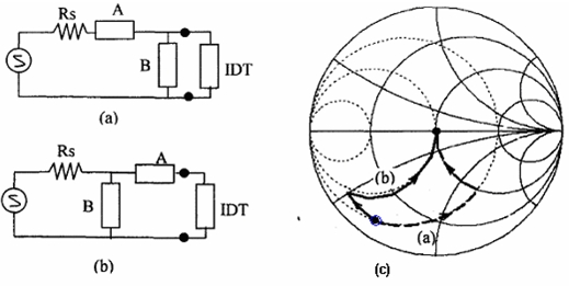 圖 1 二種簡(jiǎn)單匹配電路方案(a)、(b) 及對(duì)應(yīng)的Smith 圓圖路徑(c)