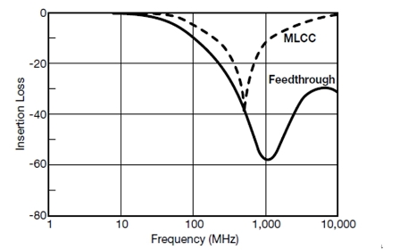 對于寄生參數來說,這種幾何結構具有幾個有趣的問題。首先,電容器的寄生電感要比具有等效電容的相當尺寸的片式電容器要小得多??梢詼y量穿心電容的寄生電感,大約為250pH。該相同的現象是在降低了電感的同時也降低了ESR(通道長度,通道長度,通道長度!)最后,穿通部分中電感的引入將增加衰減帶寬。圖8給出了一只100pF的穿心電容和一個等效的標準片式電容之間的插入損耗比較。