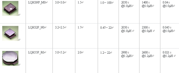 表1中展示了繞線型功率電感LQH系列的產品線。LQH系列是擁有各種不同尺寸的繞線行電感,LQH2MC_52系列為最小尺寸,用于手機等小型液晶模塊;AQH55P_R0系列為最大尺寸,用于筆記本電腦硬盤和數碼相機。
