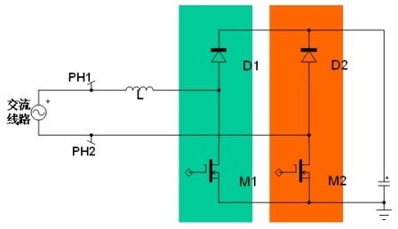 對于工頻交流輸入的正負半周期而言,這種無橋升壓電路可以等效為兩個電源電壓相反的升壓電路的組合。其中左邊的藍色方框是PH1為高電平、MOSFET開關管M2關閉時的開關單元,右邊的橙色方框是PH2為高電平、MOSFET開關管M1關閉時的開關單元。當PH1為高電平、PH2為低電平時,電路工作在正半周期,這時M2相當于體二極管(body diode),PH2通過M2接地;而當PH1為低電平、PH2為高電平時,電路工作在負半周期,這時M1相當于體二極管,PH1通過M1接地。
