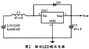 由于所選用的LED燈的額定電壓為3.3 V,而超級電容器的電壓為5.0 V,并且超級電容器在放電過程中電壓會不斷降低,因此需要有穩(wěn)壓電路來驅(qū)動LED。