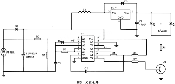 圖3中,U1為帶施密特觸發(fā)器的六反相器74HC14,其中的多諧振蕩器由第二個反相器與R5和C1構(gòu)成。這樣,在白天光線變亮?xí)r,太陽能電池電壓升高,74HC14的1腳為高電平,74HC14的2腳為低電平,8腳同樣輸出低電平,三極管Q1截至,LED關(guān)斷。而當(dāng)光線變暗時,太陽能電池電壓降低到一定程度時,HC14的1腳為低電平,HC14的2腳為高電平,多諧振蕩器開始振蕩,并經(jīng)過Y4輸出高、低電平,Q2時而導(dǎo)通時而截至,此時只要調(diào)節(jié)R6和C1的值,以把閃光頻率調(diào)節(jié)到人眼不能分辨即可,這樣做的最大好處是可以延長草坪燈工作時間。經(jīng)實(shí)際測試,該電路可以每天連續(xù)工作10小時以上,完全可以達(dá)到用戶的使用需求。