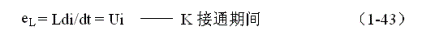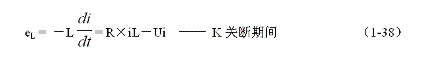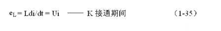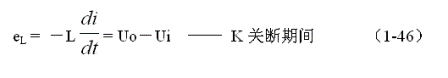 式中Ton為控制開關K接通的時間。當圖1-11-a中的控制開關K由接通狀態突然轉為關斷時,儲能電感L會把其存儲的能量(磁能)通過反電動勢進行釋放,儲能電感L產生的反電動勢為: