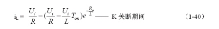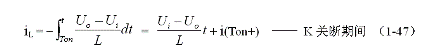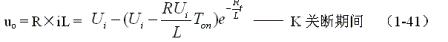 式中C為常數,把初始條件代入上式,就很容易求出C,由于控制開關K由接通狀態突然轉為關斷時,流過儲能電感L中的電流iL不能突變,因此,i(Ton+)正好等于流過儲能電感L的最大電流ILm ,所以(1-39)式可以寫為: