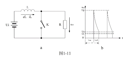 圖1-11-a是并聯式開關電源的最簡單工作原理圖,圖1-11-b是并聯式開關電源輸出電壓的波形。圖1-11-a中Ui是開關電源的工作電壓,L是儲能電感,K是控制開關,R是負載。圖1-11-b中Ui是開關電源的輸入電壓,Uo是開關電源輸出的電壓,Up是開關電源輸出的峰值電壓,Ua是開關電源輸出的平均電壓。