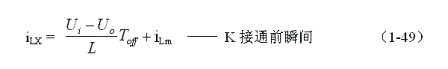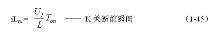 式中i(Ton+)為控制開關K從Ton轉換到Toff的瞬間之前流過電感的電流,i(Ton+)也可以寫為i(Toff-),即:控制開關K關斷或接通瞬間,之前和之后流過電感L的電流相等。實際上(1-47)式中的i(Ton+)就是(1-45)式中的iLm,因此,(1-9)式可以改寫為: