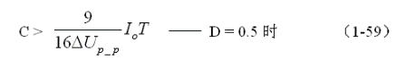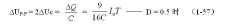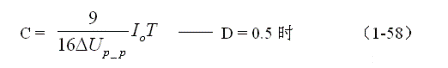 (1-58)和(1-59)式,就是計算并聯開關電源儲能濾波電容的公式(D = 0.5時)。式中:Io是流過負載電流的平均值,T為開關工作周期,ΔUP-P為濾波輸出電壓的波紋,或電壓紋波。一般波紋電壓都是取電壓增量的峰-峰值,因此,當D = 0.5時,波紋電壓等于電容器充電的電壓增量,即:ΔUP-P = 2ΔUc 。