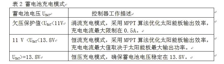 當(dāng)系統(tǒng)檢測到環(huán)境光充足,控制器就會進(jìn)入充電模式。蓄電池充電有兩個(gè)比較重要的電壓值:深度放電電壓和浮充充電電壓。前者代表在正常使用情況下蓄電池電能被用完的狀態(tài), 而后者則代表蓄電池充電的最高限制電壓,這些參數(shù)應(yīng)該從蓄電池產(chǎn)品手冊上可以查到。在設(shè)計(jì)電路中針對12V蓄電池,分別設(shè)置深度放電電壓為11V和浮充充電電壓為13.8V(皆為在室溫條件下的電壓值,軟件中這兩個(gè)值增加了相應(yīng)的溫度補(bǔ)償),具體充電模式如表2所示。