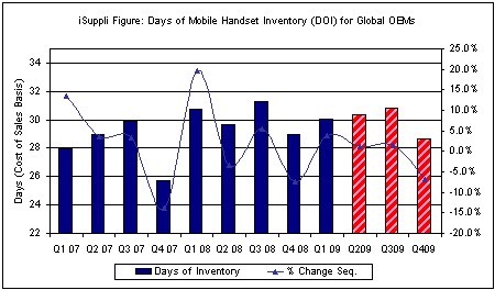 下圖所示為iSuppli公司對OEM手機庫存天數的預測。