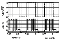 可控脈沖模式,也可稱為跳周期控制模式(SkipCycleMode)是指當處于輕載或待機條件時,由周期比PWM控制器時鐘周期大的信號控制電路某一環節,使得PWM的輸出脈沖周期性的有效或失效,如圖6所示。這樣即可實現恒定頻率下通過減小開關次數,增大占空比來提高輕載和待機的效率。該信號可以加在反饋通道,PWM信號輸出通道,PWM芯片的使能引腳(如LM2618,L6565)或者是芯片內部模塊(如NCP1200,FSD200,L6565和TinySwitch系列芯片)。