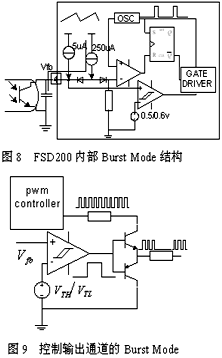 而FSD200則是通過控制內部驅動器實現可控脈沖模式,即將Vfo 腳的反饋電壓與0.6V/0.5V遲滯比較器比較,由比較結果控制門極驅動輸出,其結構可見圖8。我們可根據此原理用分立元件實現普通芯片的BurstMode功能,即檢測次級電壓判斷電源是否處于待機狀態,通過遲滯比較器,控制芯片輸出,電路如圖9所示。