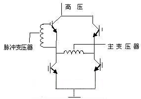 由電路可以看出,市電經整流濾波后變為311V高壓,經K1~K4功率開關管有序工作后,變為脈沖信號加至高頻變壓器的初級,脈沖的高度始終為311V。當K1,K4開通時,311V高壓電流經K1正向流入主變壓器初級,經K4流出,在變壓器初級形成一個正向脈沖。