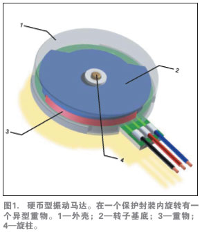 多數(shù)振動馬達(dá)由一個(gè)較小的電動馬達(dá)驅(qū)動一個(gè)偏心配重,如圖1所示。馬達(dá)為直流有刷或無刷電機(jī),有兩種基本的結(jié)構(gòu):硬幣狀(扁平)與圓柱形(條狀)。