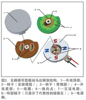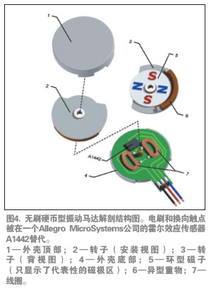 如前所述,無刷電機(jī)具有較長的壽命,并由于產(chǎn)生的電火花較少,也沒有了RFI干擾。無刷直流(BLDC)設(shè)計(jì)還提供業(yè)內(nèi)直徑最小、厚度最薄的扁平振動馬達(dá)。圖4介紹了這種馬達(dá)的基本構(gòu)造。