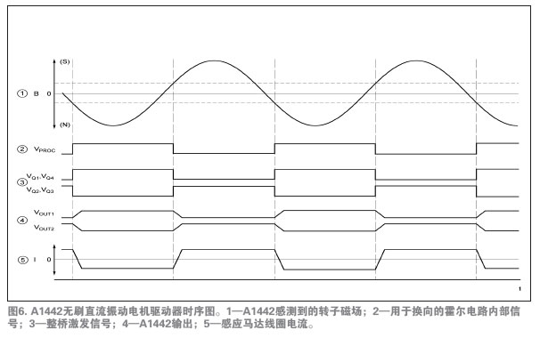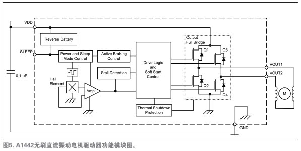 A1442是驅(qū)動馬達(dá)唯一必須的的IC。圖5所示的功能模塊圖說明了設(shè)備運(yùn)行和先進(jìn)的特性。注意圖4和圖5中,采用集成的霍爾傳感器免除了外部霍爾傳感器,從而減少了馬達(dá)PCB元件數(shù)量。唯一所需的外部元件是一種標(biāo)準(zhǔn)電路特性——位于應(yīng)用馬達(dá)安裝PCB上的0.1µF的旁路電容,它用于降低在開關(guān)電源的電感負(fù)載時(shí)產(chǎn)生的瞬時(shí)電壓峰值。
