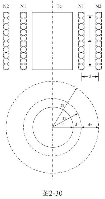 在圖2-30中,N1、N2分別為變壓器的初、次級線圈,Tc是變壓器鐵芯。r是變壓器鐵芯的半徑,r1、r2分別是變壓器初、次級線圈的半徑;d1為初級線圈到鐵芯的距離,d2為初、次級線圈之間的距離。為了分析計算簡單,這里假設變壓器初、次級線圈的匝數以及線徑相等,流過線圈的電流全部集中在線徑的中心;因此,它們之間的距離全部是兩線圈之間的中心距離,如虛線所示。