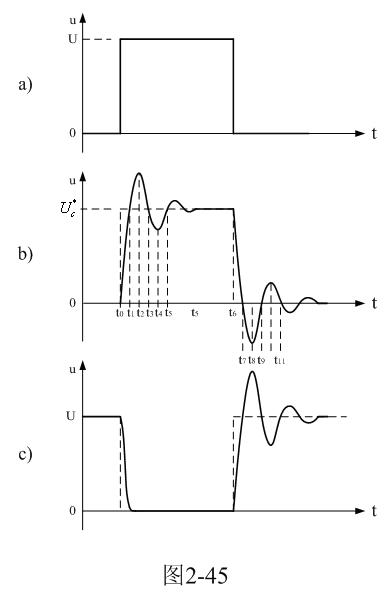 當(dāng)開關(guān)管Q1導(dǎo)通過后,開關(guān)管開始關(guān)斷,相當(dāng)于輸入脈沖電壓的上升率為負(fù)(脈沖進(jìn)入反沖階段),此時(shí),輸入脈沖電壓的上升率小于串聯(lián)振蕩回路自由振蕩電壓的上升率,因此,振蕩回路又開始再次釋放能量,振蕩回路再次產(chǎn)生阻尼振蕩,如圖2-45所示。