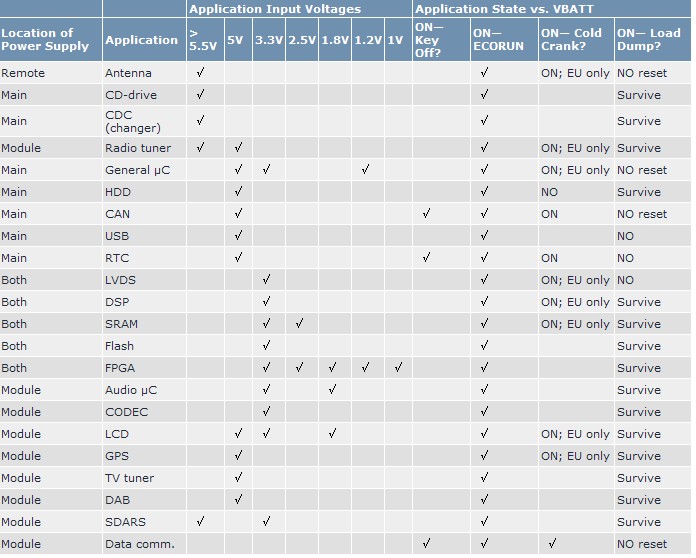 大多數系統電源的基本架構選擇應從電源要求以及汽車廠商定義的電池電壓瞬變波形入手。對于電流的要求應該反映到電路板的散熱設計。表1歸納了大多數設計的電路及電壓要求。