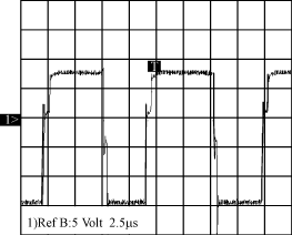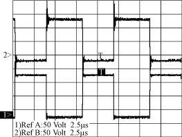 開關管S1和S的Uds波形如圖3所示,RefA為S管壓降波形,50V/div,RefB為S1管壓降波形,50V/div。電路此時工作在Vin=60V左右,S1和S的開關應力大概為120V,D=0.5左右。圖4為變壓器輸出電壓,也就是同步整流管SR1和SR的驅動信號,正的部分為SR的驅動信號,負的部分為SR1的驅動信號。實驗所得波形和分析的波形基本吻合,只是在開關轉換瞬間,電壓有小尖峰,這是由電路的雜散參數引起的。該電路的工作效率經過測量大約在90%左右,基本達到設計的要求。