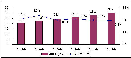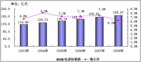 圖1 2003-2008年中國電源市場(chǎng)銷售額增長(zhǎng)情況