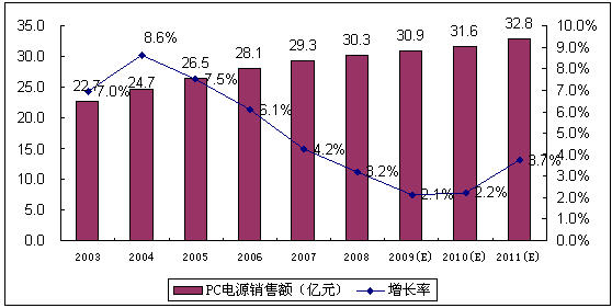 - 2009年中國PC電源市場(chǎng)的增長(zhǎng)率將進(jìn)一步下降,銷售規(guī)模同比增長(zhǎng)3.8%,銷售額同比增長(zhǎng)2.1%