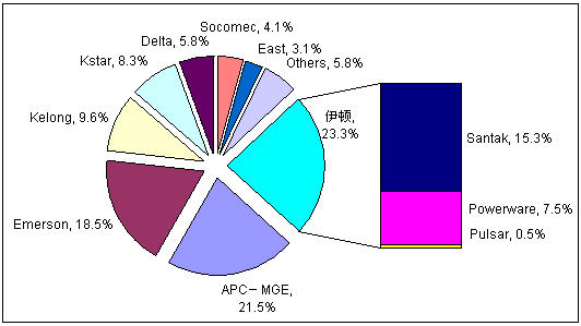 2006年以來,中國UPS市場(chǎng)開始了廠商之間一系列的并購整合,競(jìng)爭(zhēng)格局開始重新洗牌,直到2008年,新的格局才基本確立。目前,市場(chǎng)第一陣營被國際三巨頭伊頓、施耐德、艾默生占據(jù),市場(chǎng)份額達(dá)到63.3%。而科華、科士達(dá)這兩個(gè)國內(nèi)自主品牌廠商也憑借良好的發(fā)展?fàn)顟B(tài)和合理的市場(chǎng)策略脫穎而出,躋身UPS市場(chǎng)的第二陣營。