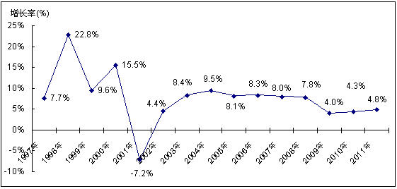 圖8 中國UPS市場(chǎng)1997-2011年市場(chǎng)銷售額增長(zhǎng)率及預(yù)測(cè)