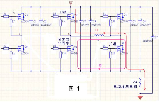 由于無刷電機具有高扭矩、長壽命、低噪聲等優(yōu)點,已在各領(lǐng)域中得到了廣泛應用,其工作原理也已被大家廣為熟知,這里不再詳述。國內(nèi)電動車電機控制器通常工作方式為三相六步,功率級原理圖如圖1所示,其中Q1, Q2為A相上管及下管;Q3, Q4為B相上管及下管;Q5, Q6為C相上管及下管。MOSFET全部使用AOT430。 MOSFET工作在兩兩導通方式,導通順序為Q1Q4→Q1Q6→Q3Q6→Q3Q2→Q5Q2→Q5Q4→Q1Q4,控制器的輸出通過調(diào)整上橋PWM脈寬實現(xiàn),PWM頻率一般設(shè)置為18KHz以上。