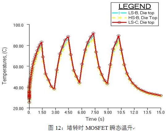 由圖10可知,堵轉(zhuǎn)時一直導通的下管最熱,溫度已接近150℃。由圖11可知,在堵轉(zhuǎn)100秒后MOSFET的溫升還未穩(wěn)定,如果一直堵轉(zhuǎn),必將燒壞MOSFET。因此,如果使用仿真中的散熱器尺寸,就不能一直堵轉(zhuǎn),必須采取相應的保護措施。我們可以采用間隙保護的方法,即當電機堵轉(zhuǎn)時,堵轉(zhuǎn)一段時間,保護一段時間,讓MOSFET的溫度不超過最大結(jié)點溫度。圖12所示為堵轉(zhuǎn)1.5s,保護1.5s的瞬態(tài)溫升示意圖,由圖可知,采用這種方法可以有效地保護MOSFET。