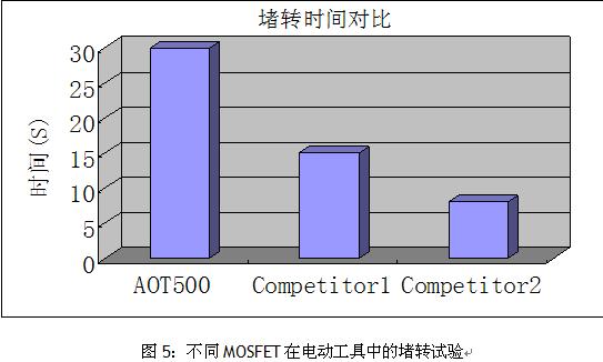 圖5為AOT500在電動工具中的堵轉試驗時間對比,可以看出,AOT500能承受的堵轉時間比其它的電動工具常用的MOSFET要長很多,大大提高了電動工具的可靠性。